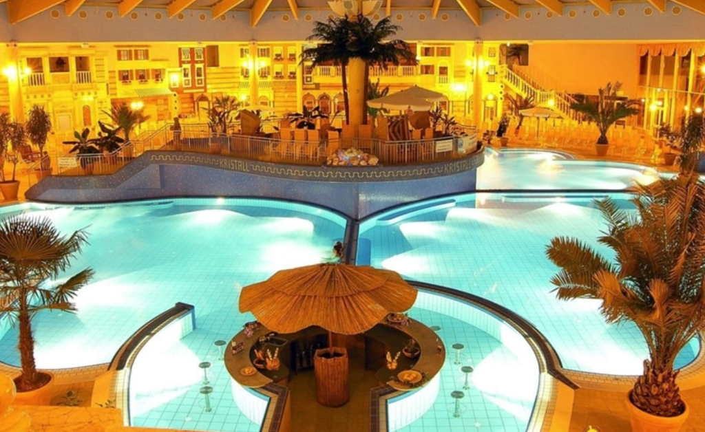 Größte Therme Europas (~180.000 m²): Palmen, 27 Rutschen, Wellenbecken, Themenbereiche (Galaxy, Vital Oase, Vitaltherme & Saunen). „Sauna-Paradies“ mit 28 Saunen.